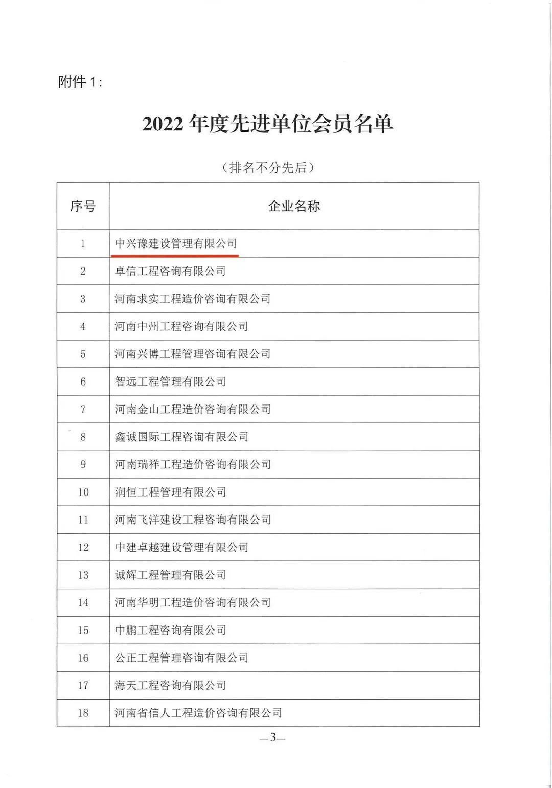 近日,河南省注册造价工程师协会公布了“河南省注册造价工程师协会2022年度先进单位会员、先进个人会员的通告”。我公司荣获河南省注册造价工程师协会2022年度先进单位会员荣誉称号,徐文、李杰、贾世军三位同志获得先进个人会员的荣誉。