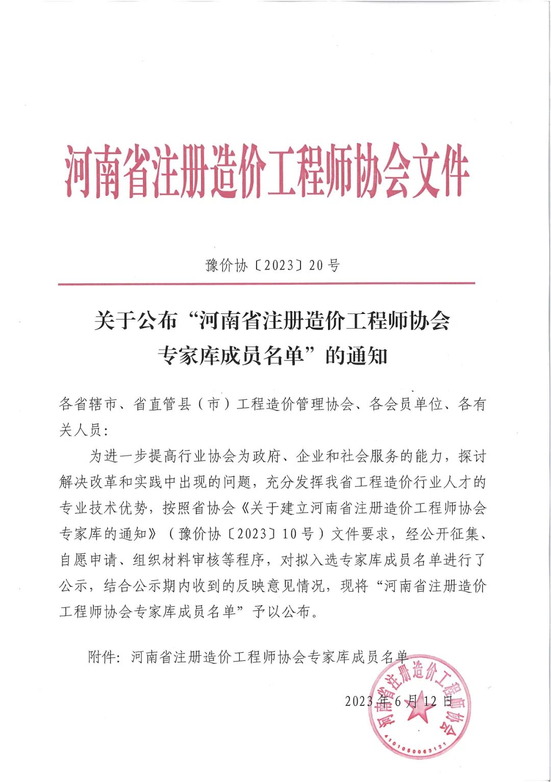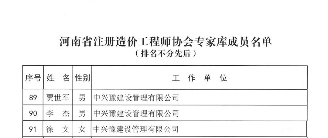6月12日,河南省注册造价工程师协会公布了“河南省注册造价工程师协会专家库成员名单”的通知,我公司贾世军、李杰、徐文3名注册造价师顺利入围专家库。